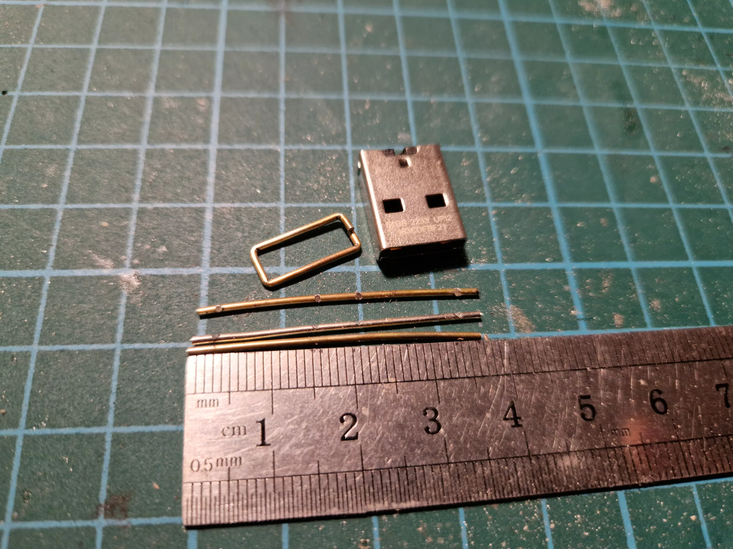 The clasp is just a wire loop curved in a way to click on the bump. I cut about 70mm of a 1mm wire and form a U-shape. Then it goes into the clasp hinge I attached earlier to the upper frame. While on the hinge I use pliers to bend the clasp wire in a kind of 8-shape pattern to give it some flexibility to be able to click onto the bumb on the USB frame.