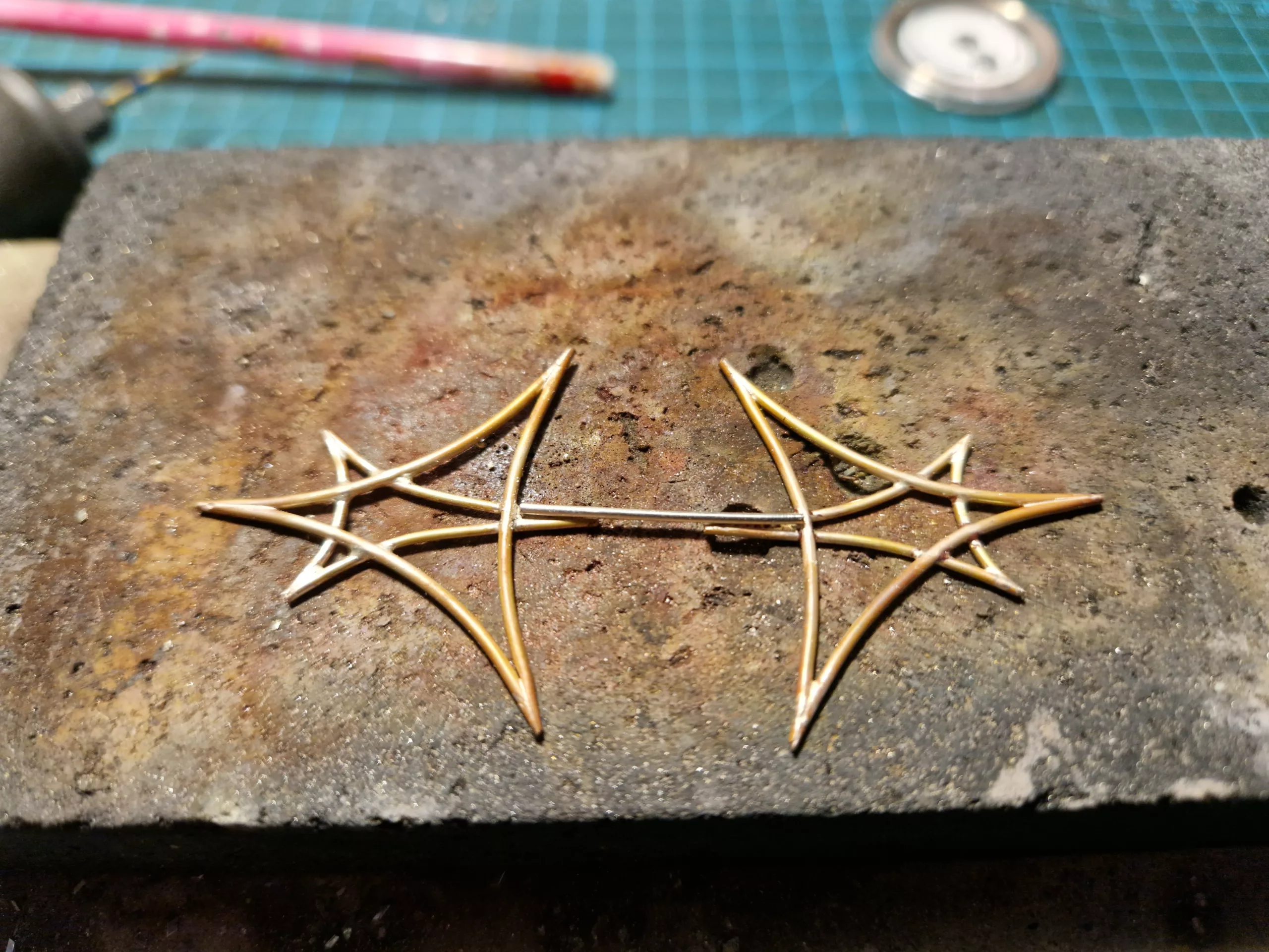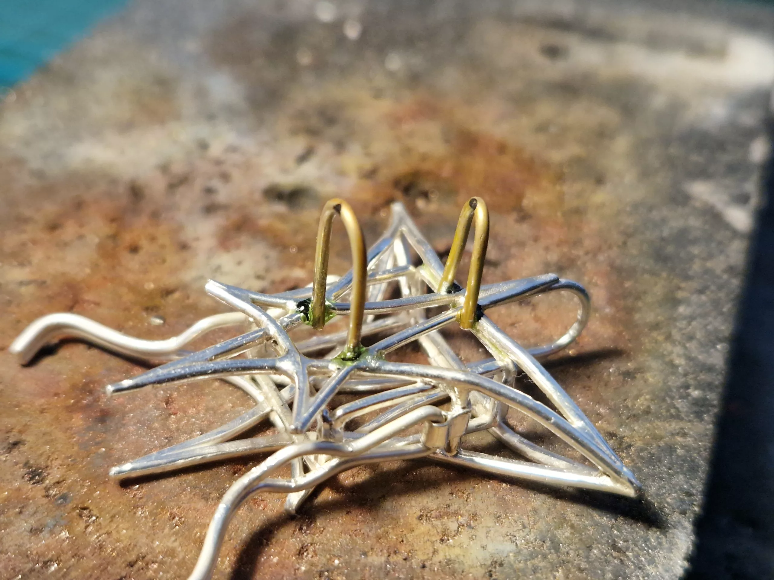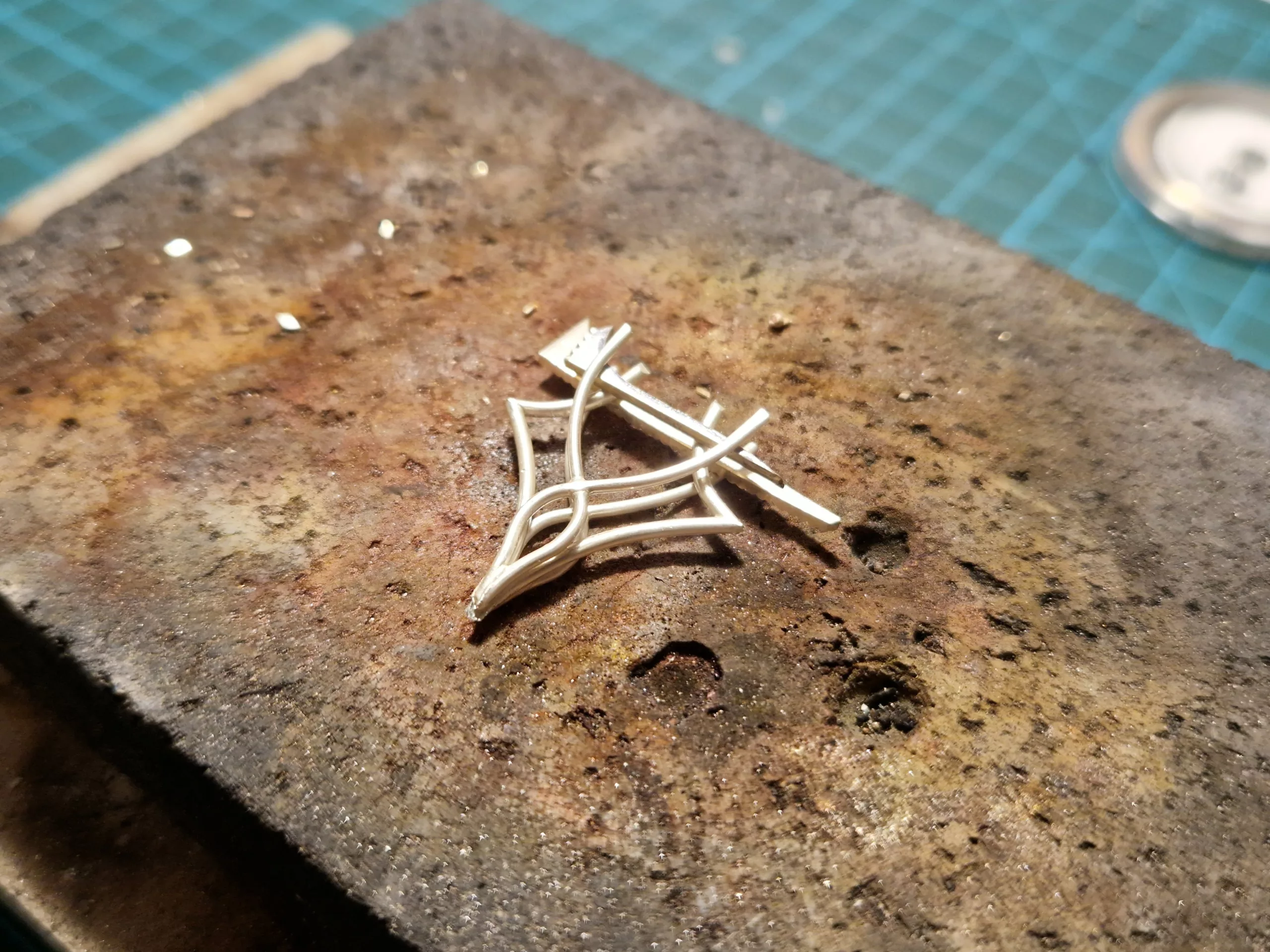 I mainly use pliers and cutters to cut and bend wires into the shape following the design sketch. Once all 3 decoration pieces are ready I solder them together by their pointy parts. It is important to join these pieces only at the pointy part so that it is possible to spread them wide enough to attach to the USB basket. In order to not solder the piece where they shouldn’t be I used a piece of scrap silver as a separator.