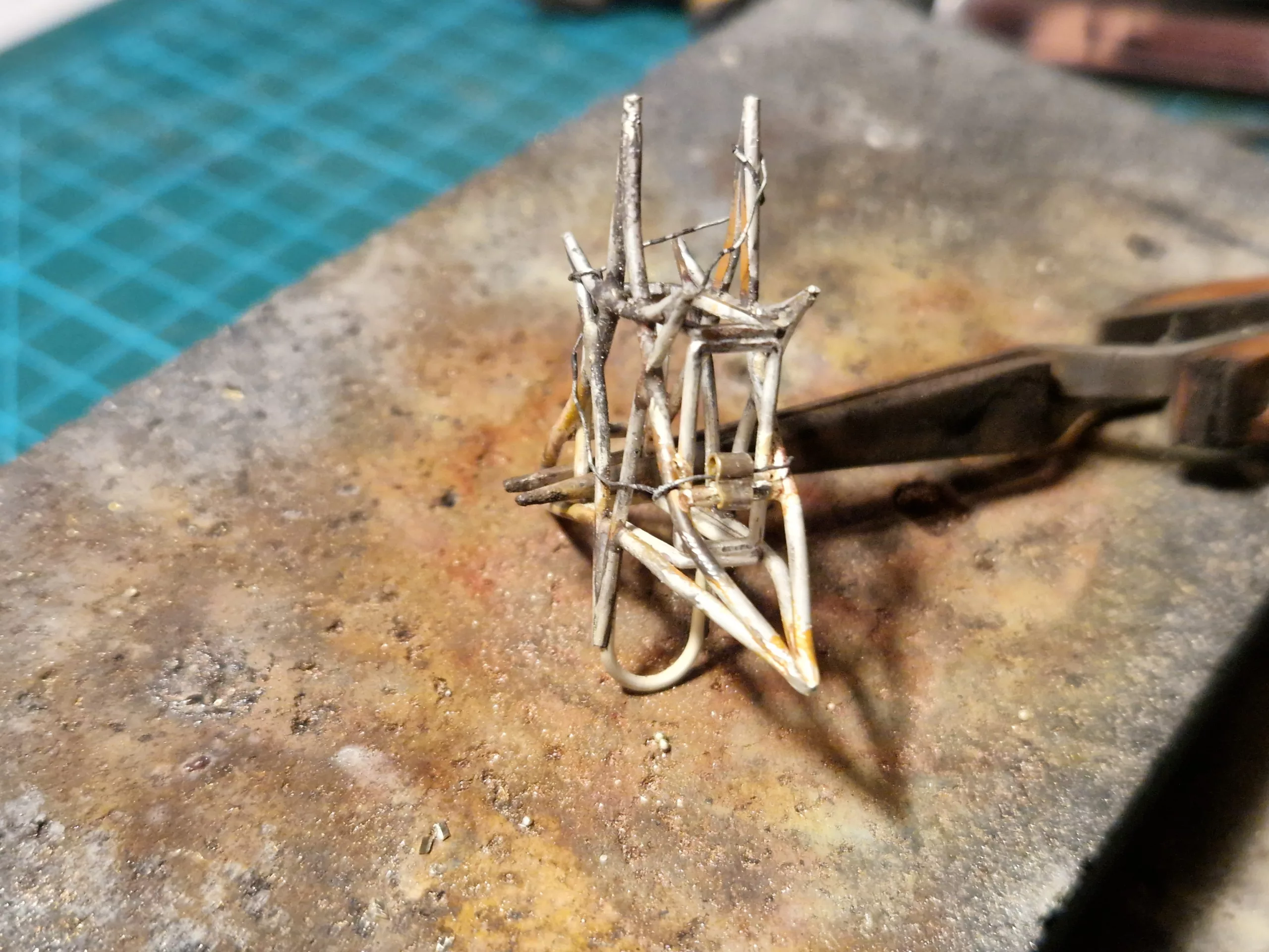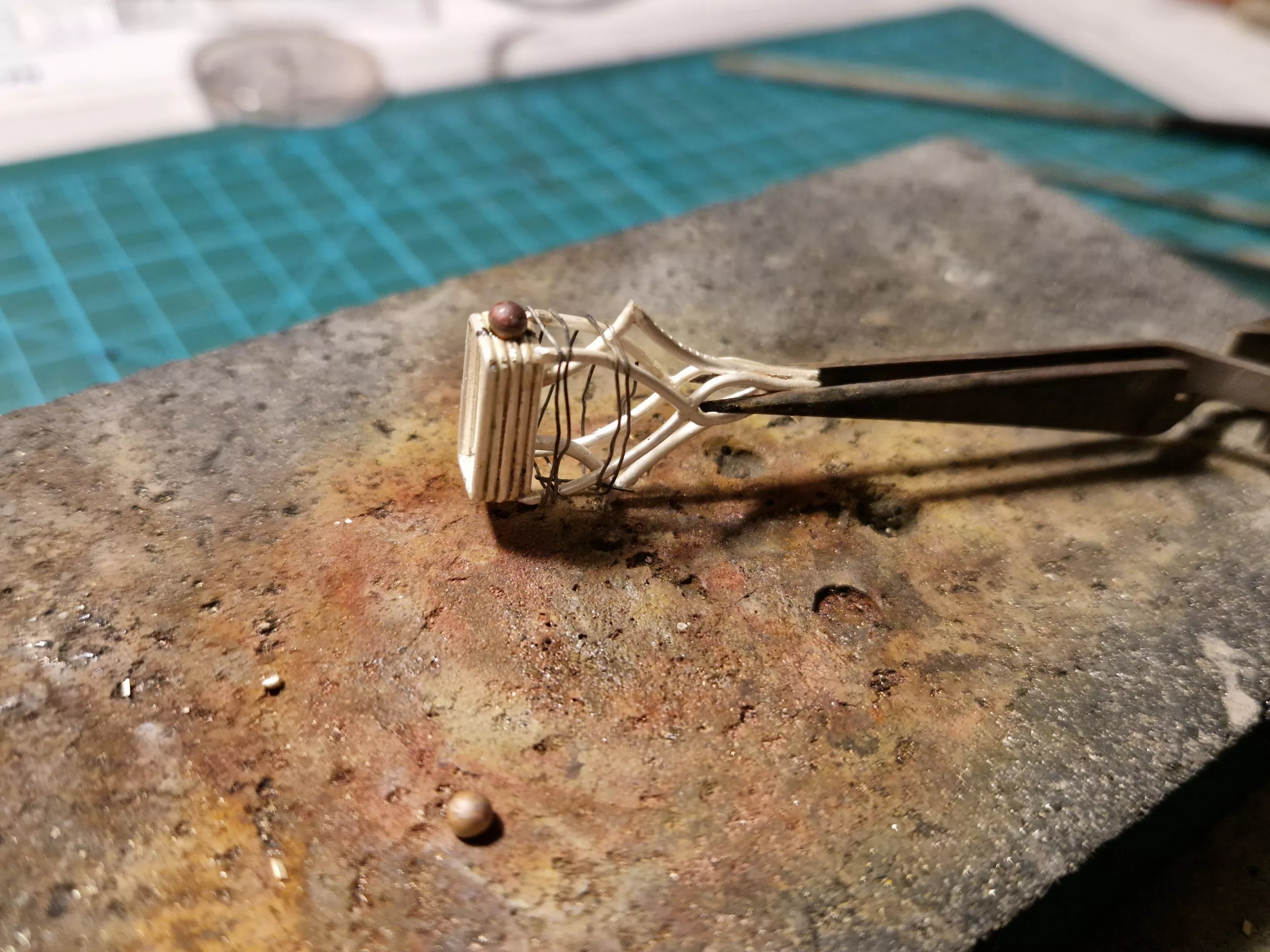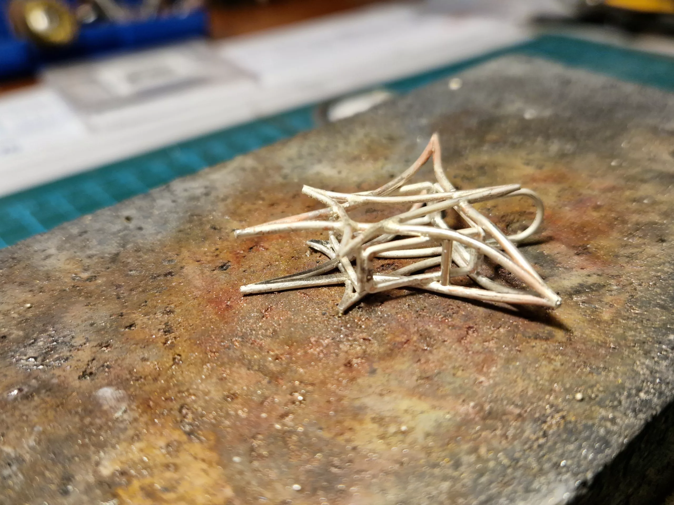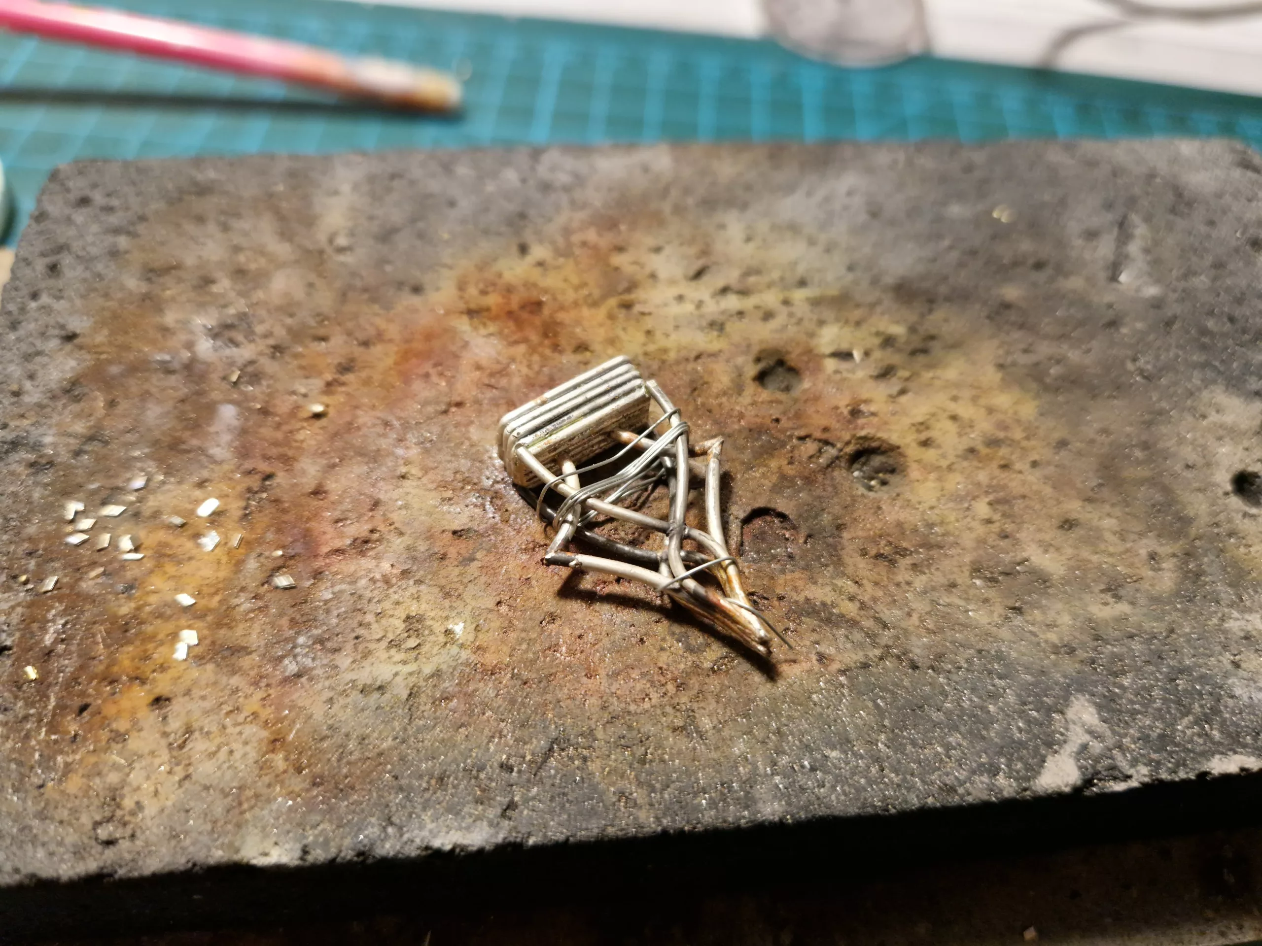 The culmination point of the upper frame assembly is aligning the wireframes, adding the USB cage and soldering all of these toghether. There are multiple connection points and it is important to solder each one of them to ensure stiffness of the pendant. I use a lot of steel wire to hold all the pieces together while soldering. It also helps to protect already existing joints from the heat.