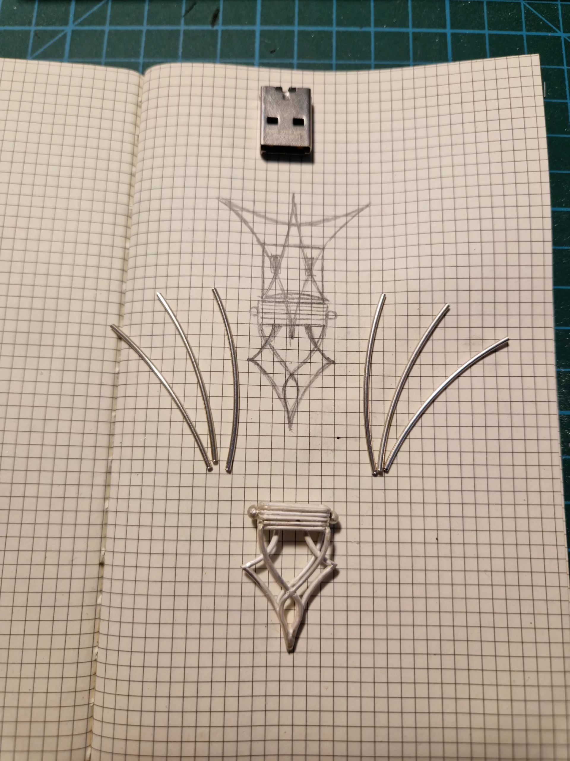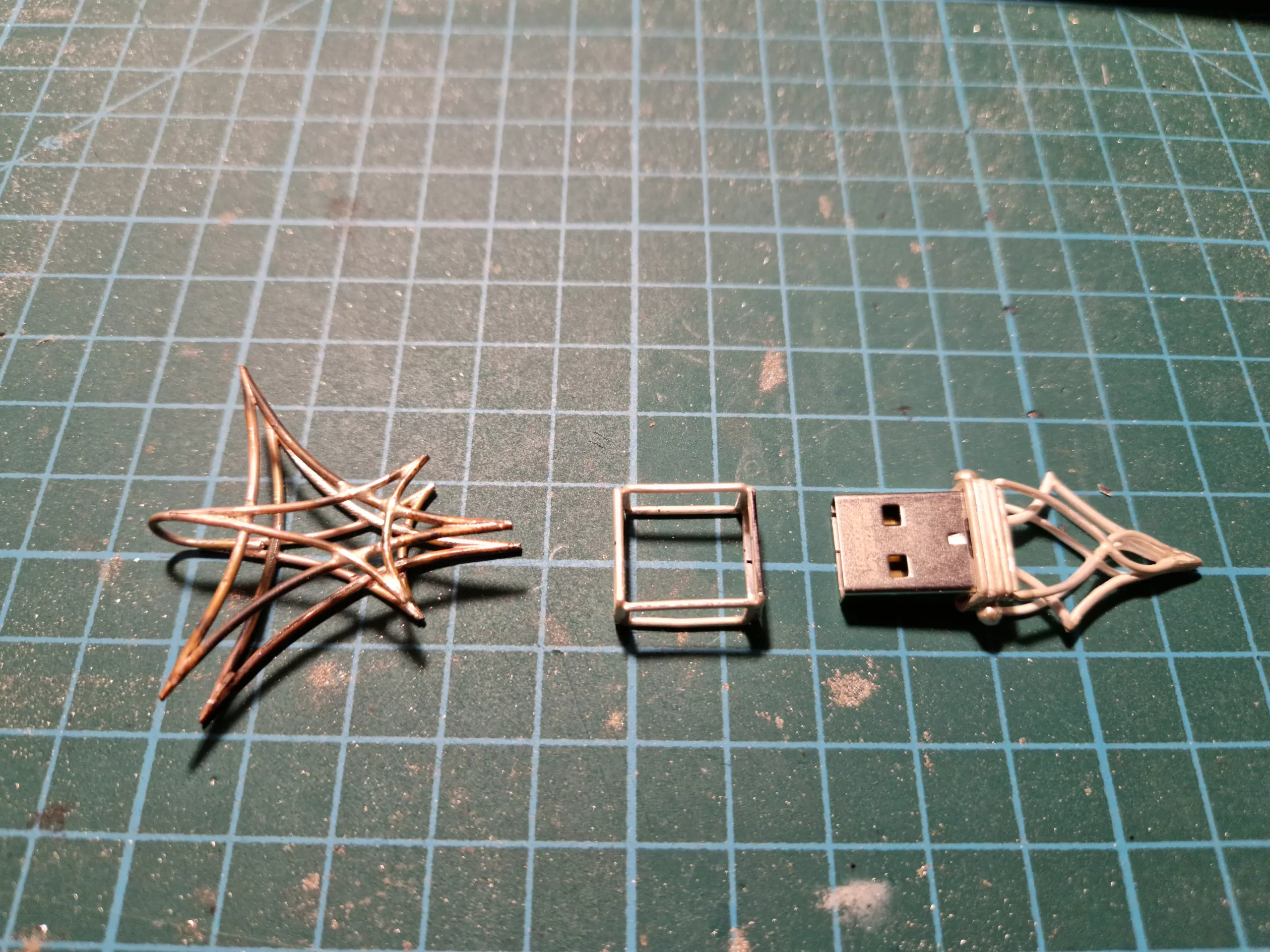 The trick here is to connect the central tips of the wireframes with a 1mm piece of wire about 30mm long. Bending this wire will make it possible to align wireframes on top of each other ensuring enough space for USB drive in between.