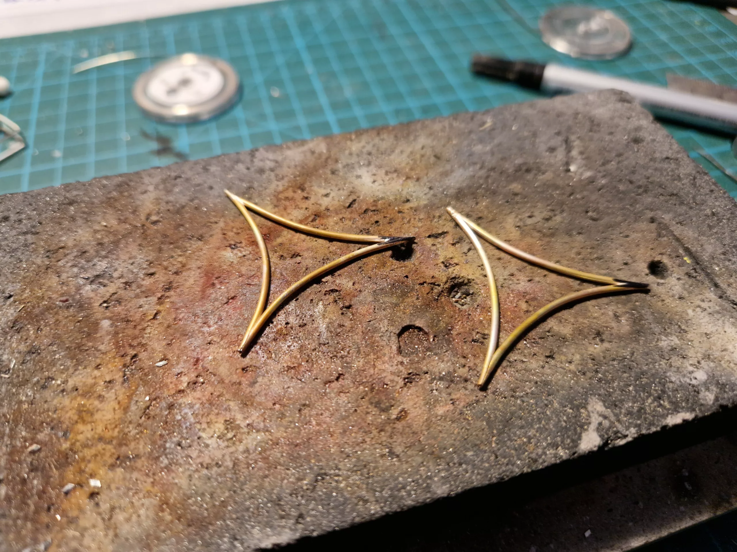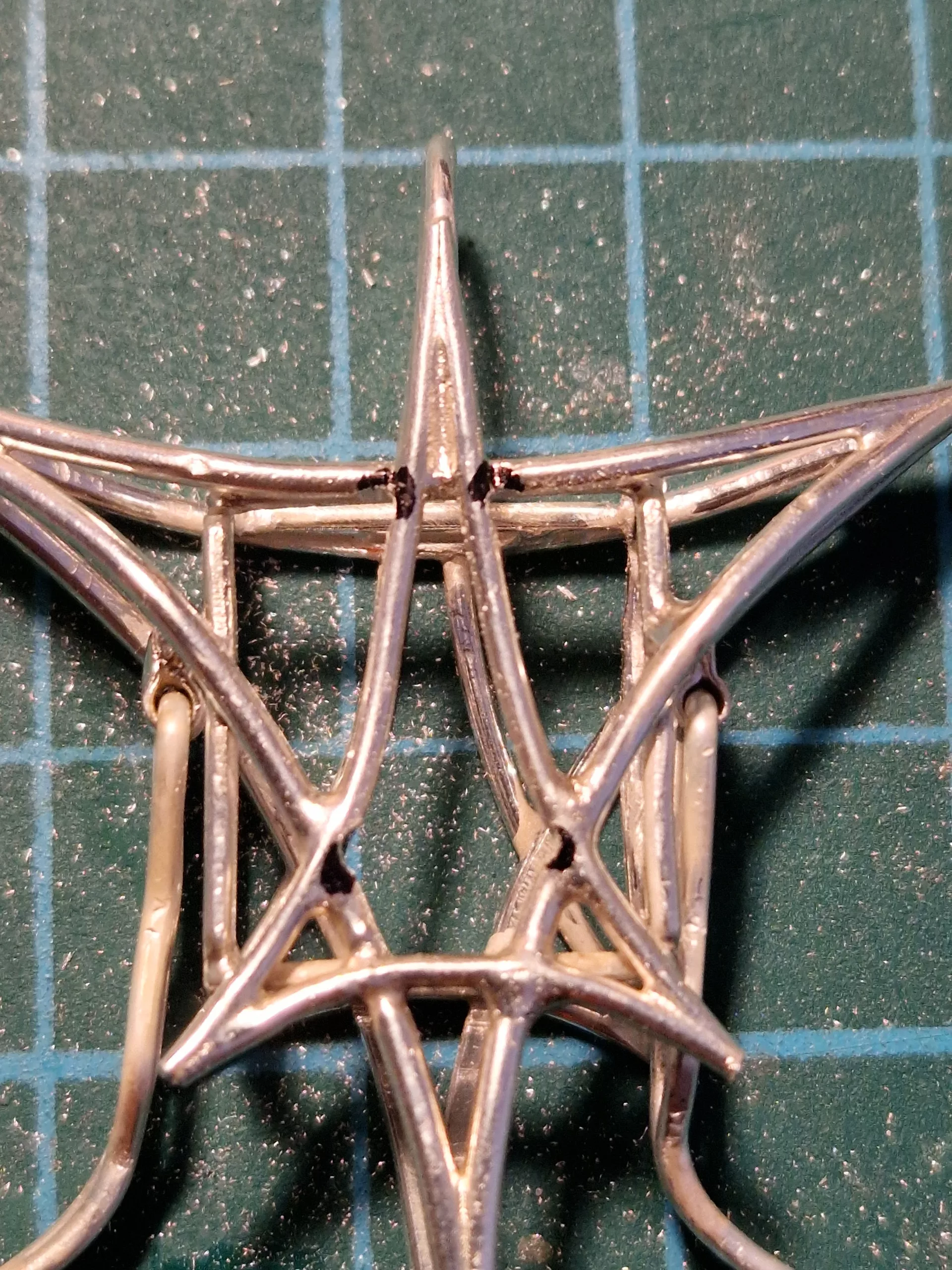 Once there are four triangles it is time to merge them into two. I place smaller triangle on top of the larger one and mark the points of where they interlay. Then I use a fine burr to cut grooves in the larger triangles so the smaller one could sink in them. When the triangles are lined up it is time to reinforce the interlaying points with medium solder.