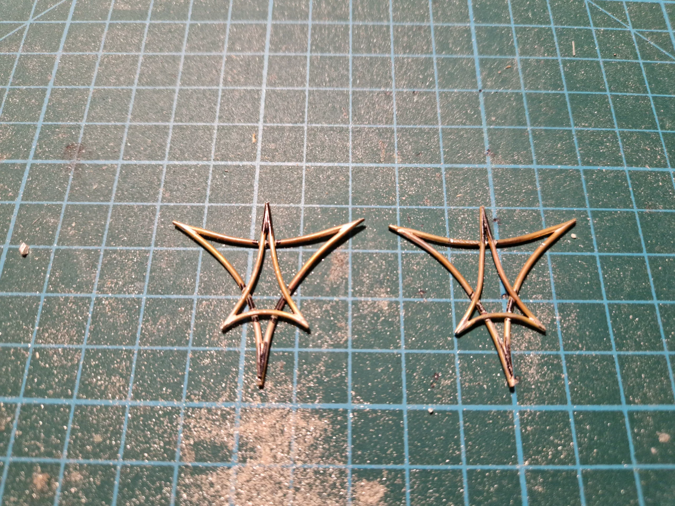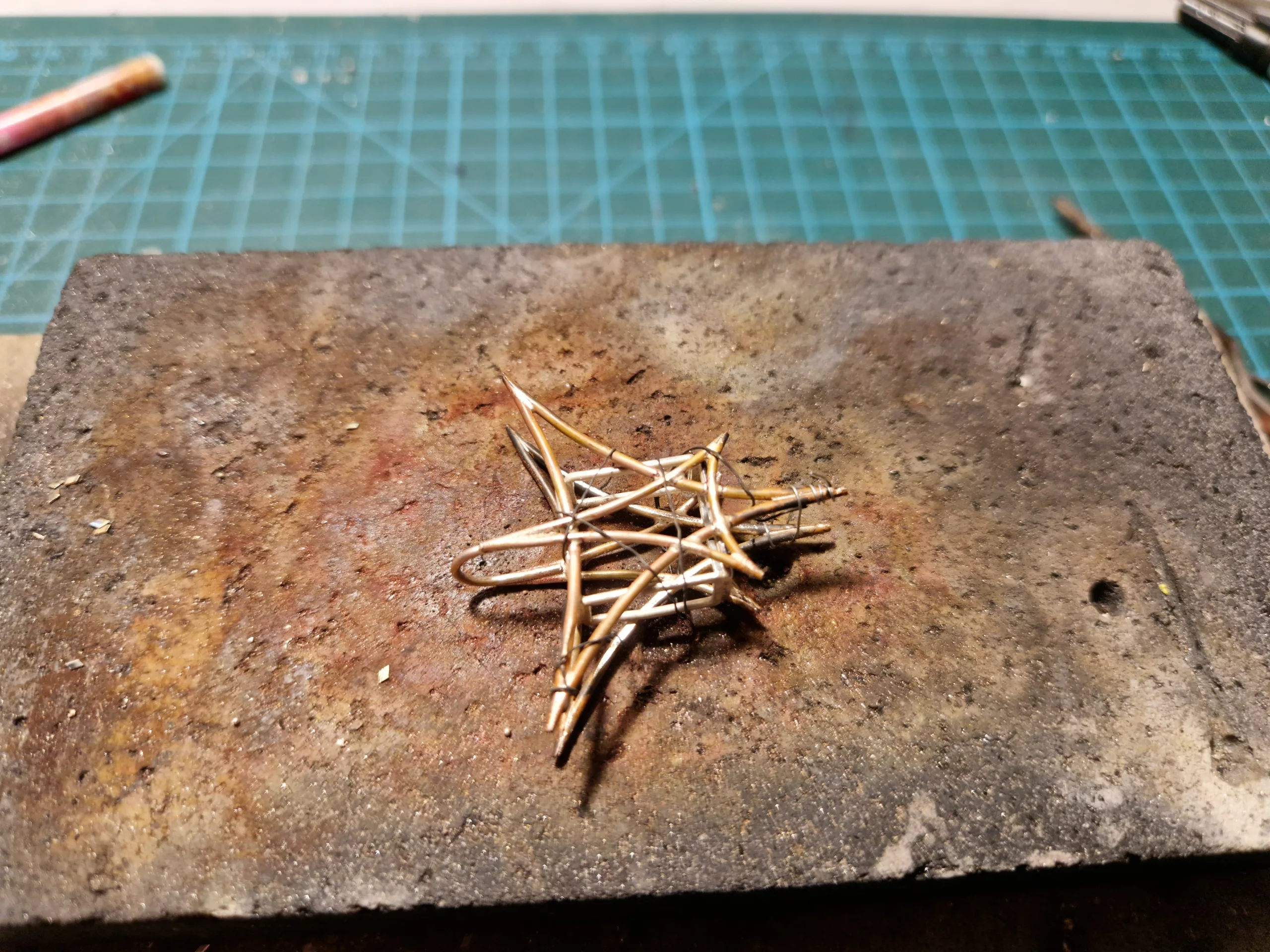 It is very important to grind off a tip of each wire to simplify soldering. The point here is to maximise the surface two pieces of wire will connect to each other. So I preapred all 6 piece of wire and soldered them in pairs to form 2 large triangles.
