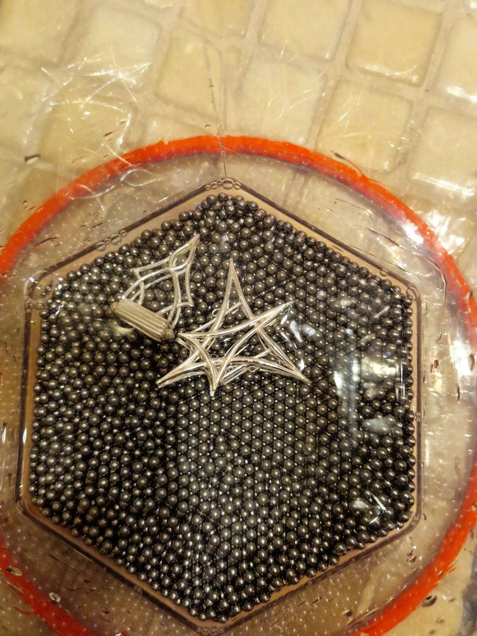 Not only the tumbling polishes off the imperfections on th silver piece, it also make it stronger by a process called work hardening. Taken out of the tumbler the pendant is ready for some hand polishing, adding clasps and setting the USB drive.