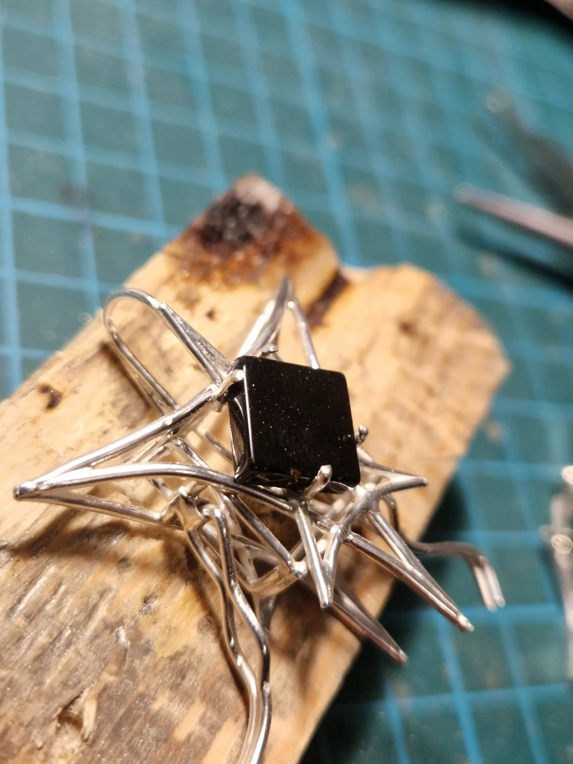 Once soldered I cut off the top arching parts of the horseshoe shaped additions and file the tips to smooth them out. The last accord is to put the stone in its place and gently bend the tips of the prongs so they embrace the onyx tightly.
