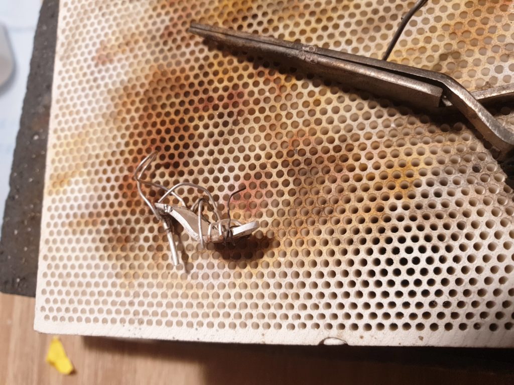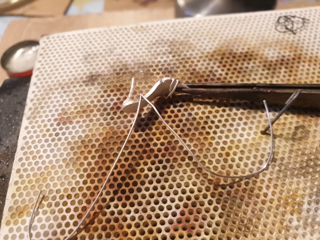 Once sole is connected with its heel it is time to add straps. These straps are supposed to hold the foot in the real shoe, in my case I leave it to imagination. With no sketch or plan I just cut some wires and solder them to the sole imagining how the foot would like in it.